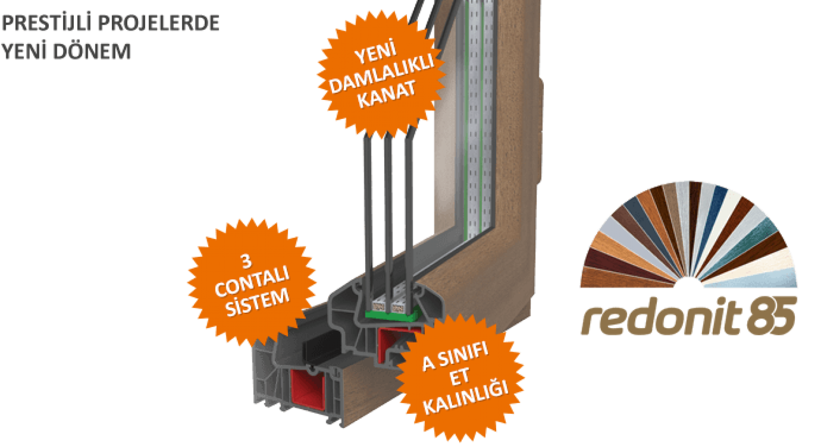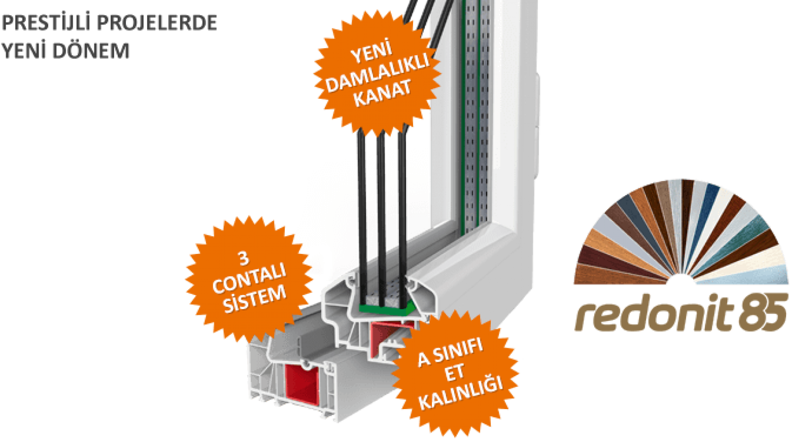 Hayatımız ve mekan anlayışımız büyük bir hızla değişiyor. Zamanımızı daha verimli kullanmaya çalışıyoruz ve yaşadığımız mekânlarda yıllarca sorun yaşamayacağımız tercihler yapmaya özen gösteriyoruz. Yapı teknolojisi daha yüksek konfor ve işlevsellik üzerine şekillenmeye devam ediyor. REDONİT 85, PVC pencere ve profil standartlarını farklı bir boyuta taşıyan; güç, estetik, ısı ve ses yalıtımı kriterlerinde tüm gereklilikleri sağlayan prestijli projelerin standartları aşan yeni serisi. Yüksek ısı ve ses yalıtımıyla daha fazla konfor ve estetikte farklı bir boyut arayışında olanlar için tasarlandı. 85 mm profil genişliği, A sınıfı et kalınlığı, 7 odacıklı tasarımı, 3 contalı sistemi ile en zorlu iklim koşullarında dahi termal ve akustik yalıtım değerlerinde maksimum performans sergiliyor. 21 faklı renk ve desende lamine kaplama seçeneği ile Redonit, elit projelerin standart üstü serisi. Dekoratif beklentilerinizi karşılamak için iç ve dış yüzeylerde farklı renk kullanımı da mümkün. Redonit, giderek daha duyarlı hale geldiğimiz gürültüye karşı mükemmel akustik yalıtımı sunuyor, 3 contalı sistemiyle ekstra sızdırmazlık sağlıyor. Seçkin beğenilerle yaşam konforunu artırmak isteyenler için kusursuz bir pencere sistemi olan Redonit sizlerle tanışmayı bekliyor.